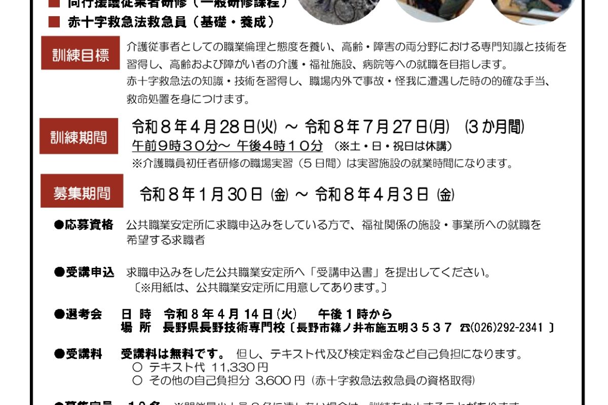 令和8年度公共職業訓練 介護職員養成科(NN-02)受講者募集中 募集期間:令和 …